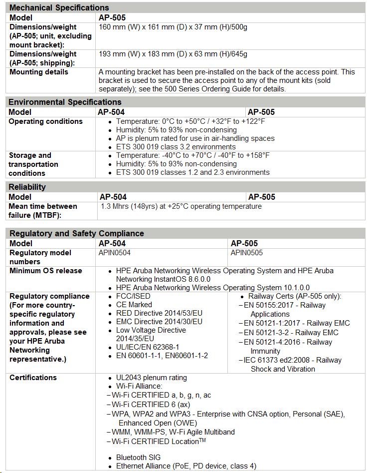 Technical specifications HPE Aruba Networking AP-505 (RW) Dual Radio 2x2 802.11ax Internal Antennas Unified Campus AP Product Number R2H28A Differentiator Available everywhere except US, Israel, Japan and Egypt Certifications UL2043 plenum rating Wi-Fi Alliance: Wi-Fi CERTIFIED a, b, g, n, ac Wi-Fi CERTIFIED 6 (ax) WPA, WPA2 and WPA3-Enterprise with CNSA option, Personal (SAE), Enhanced Open (OWE) WMM, WMM-PS, W-Fi Agile Multiband Wi-Fi CERTIFIED Location™ Bluetooth SIG Ethernet Alliance (PoE, PD device, Class 4) Regulatory FCC/ISED CE Marked RED Directive 2014/53/EU EMC Directive 2014/30/EU Low Voltage Directive 2014/35/EU UL/IEC/EN 62368-1 EN 60601-1-1, EN60601-1-2 Wi-Fi antenna Two integrated dual-band downtilt omni-directional antennas for 2x2 MIMO with peak antenna gain of 4.9dBi in 2.4GHz and 5.7dBi in 5GHz. Connectivity, standard Wi-Fi 6 (IEEE 802.11ax) Ports E0: Ethernet wired network port (RJ-45) USB 2.0 host interface (type A connector) Serial console interface (proprietary, micro-B USB physical jack) Kensington security slot. Mounting See product ordering guide Power consumption Maximum (worst-case) power consumption (without/with a USB device attached): PoE powered (802.3at): 11.0W / 16.5W PoE powered (802.3af): 11.0W / 13.5W This assumes that up to 5W is supplied to the attached USB device Maximum (worst-case) power consumption in idle mode: 4.3W (DC) or 6.2W (PoE) Maximum (worst-case) power consumption in deep-sleep mode: 1.7W (DC) or 3.7W (PoE) Radio coverage AP type: Indoor, dual radio, 5 GHz and 2.4 GHz 802.11ax 2x2 MIMO 5 GHz radio: Two spatial stream Single User (SU) MIMO for up to 1.2 Gbps wireless data rate with 2SS HE80 802.11ax client devices. 2.4 GHz radio: Two spatial stream Single User (SU) MIMO for up to 574 Mbps (287 Mbps) wireless data rate with 2SS HE40 (HE20) 802.11ax client devices. Warranty Limited lifetime warranty. See the warranty duration. Product dimensions (metric) 37 x 160 x 161 mm Weight 500 g