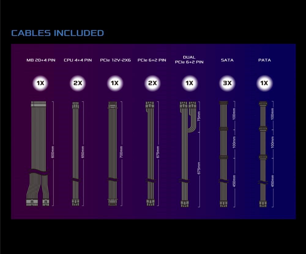 PSU format:ATX; Connectors:8pin CPU 1x, PCIe 8-pin, SATA 15-pin, Molex; Motherboard connectors:ATX 24-pin; PSU properties:Modular cabling