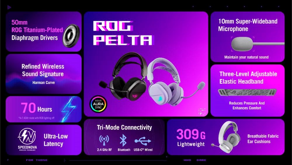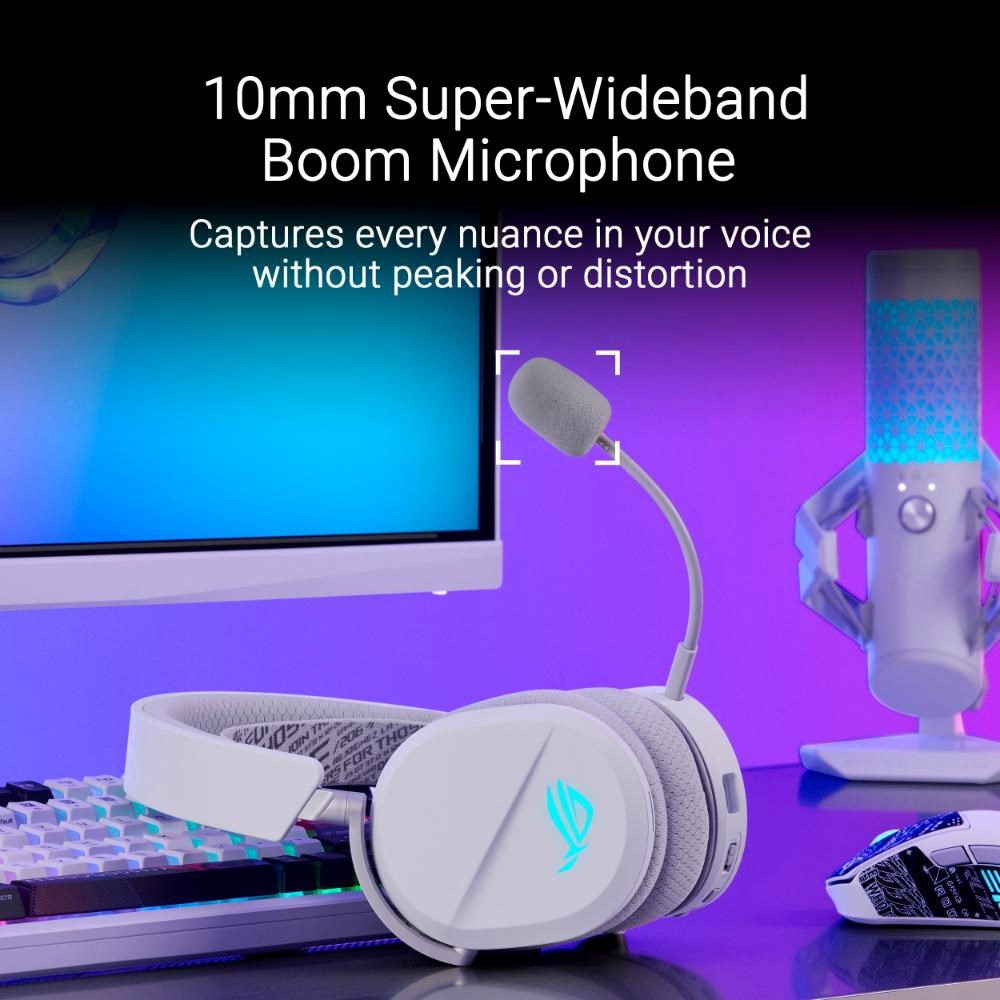 Gamingowe słuchawki z trzema trybami RGB, technologią bezprzewodową ROG SpeedNova, 50mm membranami pokrytymi tytanem, ulepszonym bezprzewodowym dźwiękiem, mikrofonem ramieniowym super szerokopasmowym 10mm, lekkim designem ważącym 309 g oraz świetlnym podświetleniem ASUS Aura Sync RGB