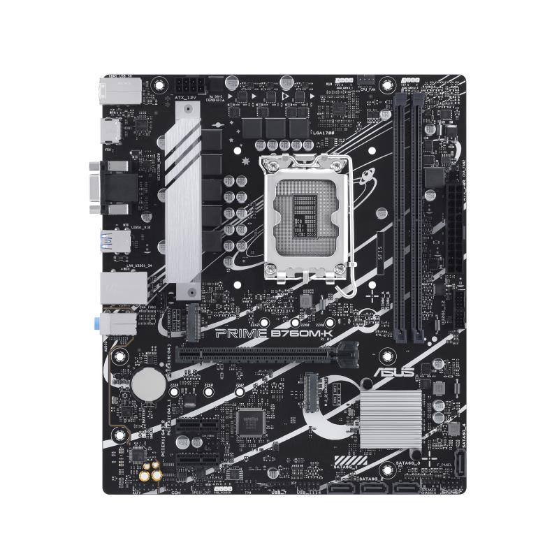 ASUS Prime B760M-K, an Intel® B760 LGA 1700 mATX motherboard with PCIe 4.0, two PCIe 4.0 M.2 slots, DDR5, Realtek 2.5Gb Ethernet, VGA, HDMI™, SATA 6 Gbps, front USB 3.2 Gen 1, Aura Sync