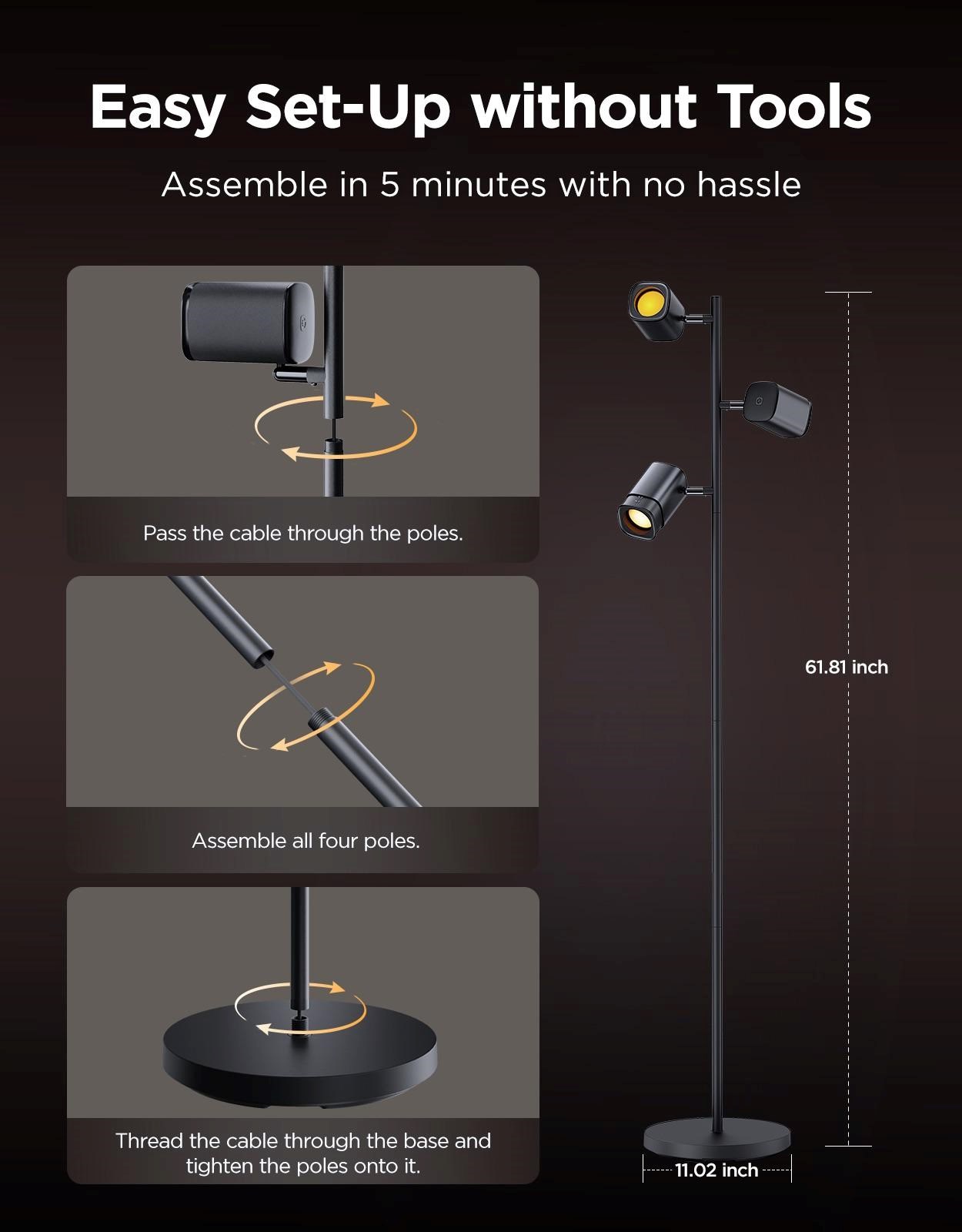 Govee Tree Floor Lamp jest gotowa do użycia od razu, bez skomplikowanego montażu. Wystarczy rozpakować lampę, podłączyć i uruchomić aplikację – wszystko jest szybkie i intuicyjne. Dzięki temu możesz korzystać z inteligentnego oświetlenia od razu, bez zbędnych problemów czy narzędzi.