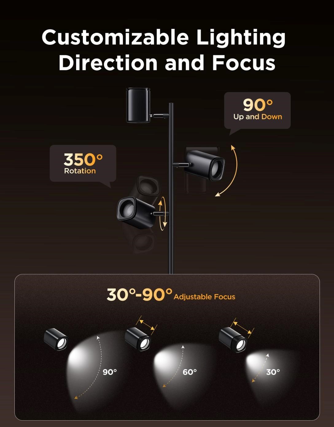 W pełni regulowane ramiona i głowice umożliwiają osiągnięcie idealnego oświetlenia. Lampy mają ostrość w zakresie 30°–90° do rozproszonego lub skupionego światła. Ramiona obracają się o 350° poziomo i 90° pionowo. Daje to możliwość precyzyjnego oświetlenia każdego zakątka Twojego pokoju.