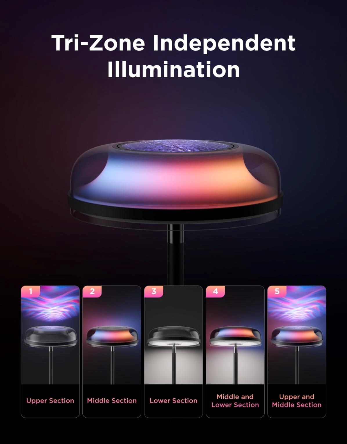 Trojdzielne zónowe oświetlenie pozwala na indywidualne ustawienie dolnej, środkowej i górnej części lampy zgodnie z Twoimi potrzebami. Dolna LED zapewnia praktyczne codzienne światło, środkowa strefa delikatnie oświetla przestrzeń, a efekt projekcji na górze dodaje dramatycznego wizualnego efektu. Dzięki temu systemowi zawsze można stworzyć idealną atmosferę na każdą okazję.
