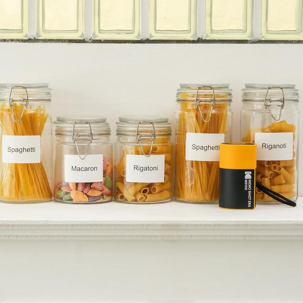 Zestaw kaset z etykietami kompatybilnych z aparatem KODAK Memo Shot Era zawiera 9 rolek: 6 białych, 1 zieloną, 1 różową i 1 żółtą. Każda rolka pozwala na wydrukowanie do 30 etykiet.