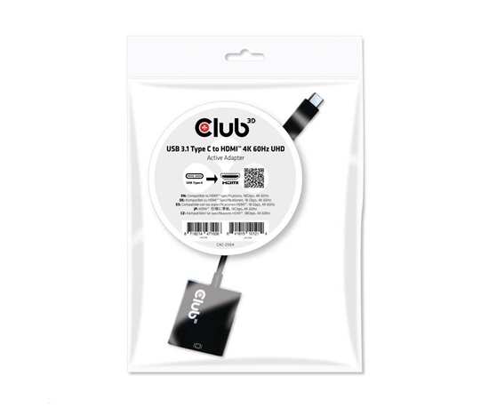 Club 3D CAC-2504 to aktywny konwerter sygnału HDMI ™. Adapter USB 3.1 Type C na HDMI ™ 2.0 UHD 4K 60 Hz to najprostsze rozwiązanie do podłączenia urządzenia źródłowego z konektorem USB 3.1 Type C z trybem alternatywnym DisplayPort ™ do monitora (U)HD, telewizora lub projektora z interfejsem HDMI ™ 2.0. Adapter jest kompaktowy i bardzo przenośny. Zasilany z portu USB-C, nie wymaga zewnętrznego zasilania i jest idealny do stosowania z laptopami i ultrabookami.