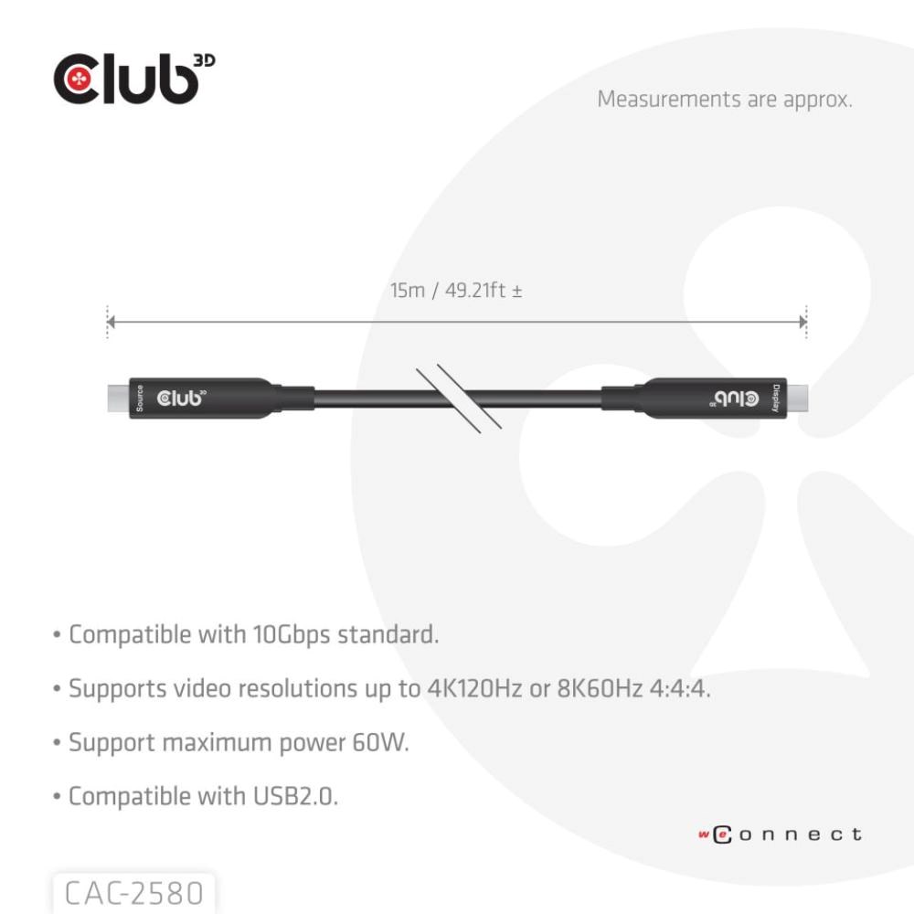 Club3D Kabel USB-C, 10 Gbps, 4K120Hz, 8K60Hz, 60W, Bi-directional, 15m, černá