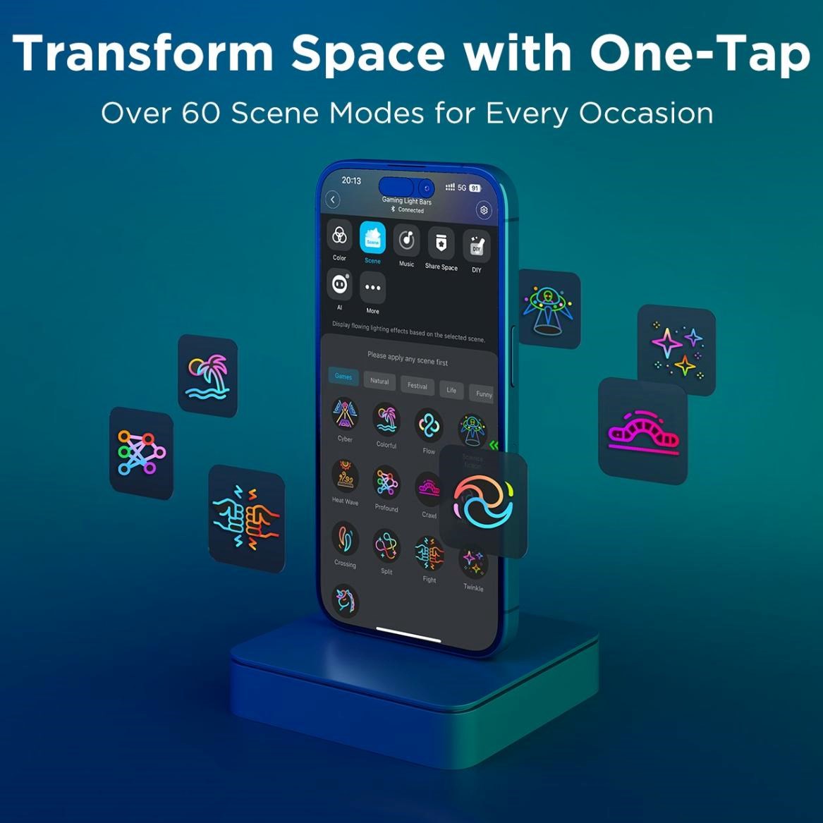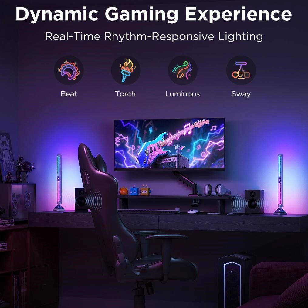 Panele oferują ponad 60 unikalnych scen świetlnych, które pozwalają dostosować oświetlenie do nastroju i stylu. Specjalne efekty wizualne potrafią stworzyć dynamiczną i atrakcyjną atmosferę, nie tylko podczas grania, ale także podczas oglądania filmów czy słuchania muzyki. Funkcja synchronizacji z muzyką sprawia, że światła reagują w czasie rzeczywistym na rytm i dźwięk, zapewniając żywą i interaktywną atmosferę, która ożywi każdy pokój.