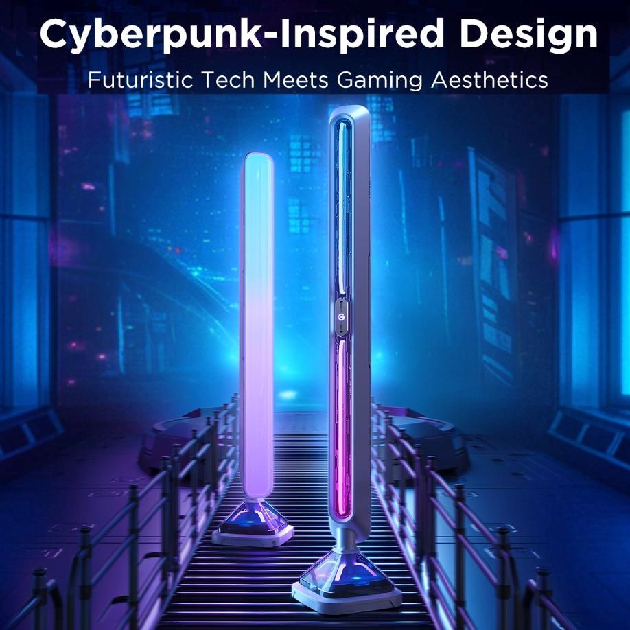 Panele świetlne Govee Gaming Light Bars Pro, przeznaczone do ustawienia obok telewizora lub monitora. Te eleganckie listwy świetlne z cyberpunkowym designem tworzą zachwycającą atmosferę wizualną. Niezależnie od tego, czy zanurzasz się w grze, czy oglądasz ulubiony film, te listwy wprowadzają dynamiczne i żywe kolory, które każdy moment czynią bardziej intensywnym.