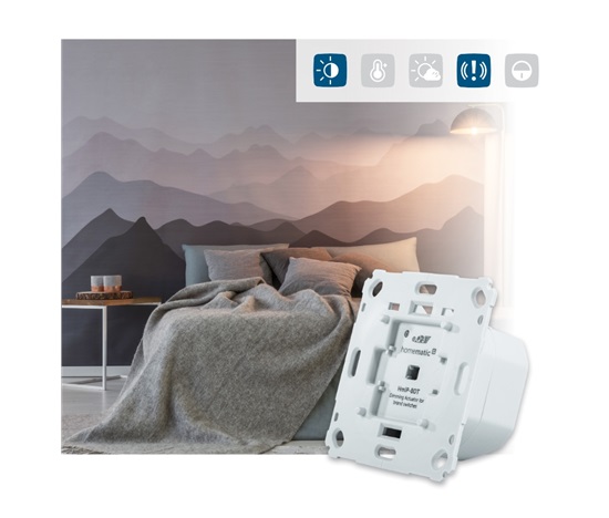 Programowalny bezprzewodowy Stmívací akční člen (HmIP-BDT) do zabudowy, zasilany z sieci 230 V, jest częścią systemu inteligentnego domu Homematic IP.