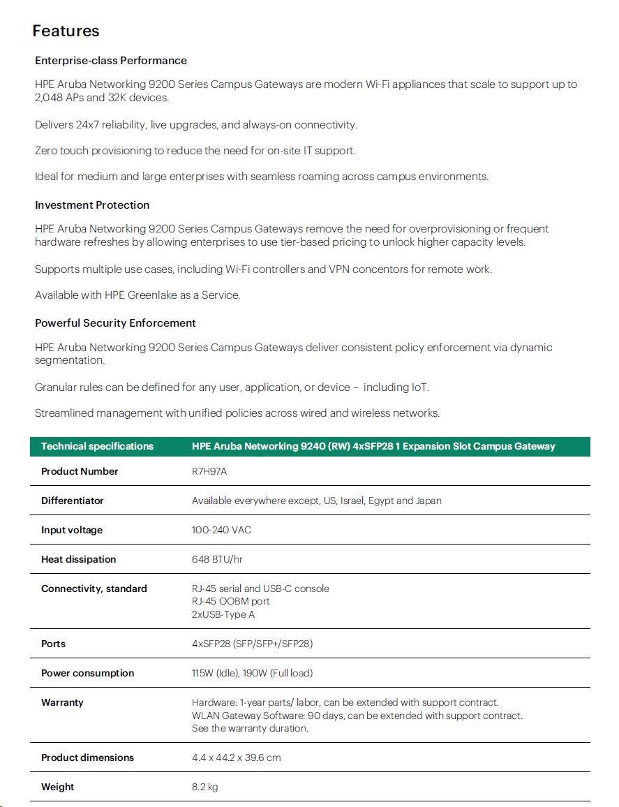 HPE Aruba Networking 9240 (RW) 4xSFP28 1 Expansion Slot Campus Gateway
