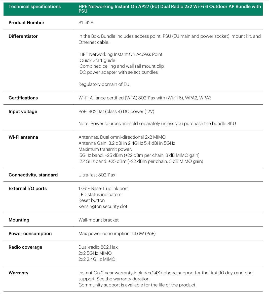 HPE Networking Instant On AP27 (EU) Dual Radio 2x2 Wi-Fi 6 Outdoor AP Bundle with PS (Includes 30W PoE midspan injector with EU Power Cord)