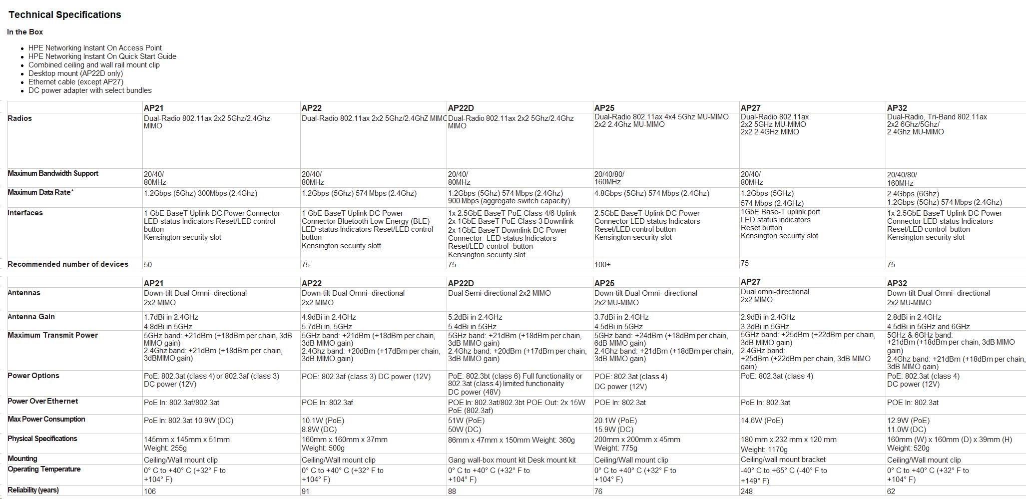 Multiuser, Multiple Input, Multiple Output (MU-MIMO) AP25 supports MIMO, allowing service to multiple clients (Wi-Fi 5 and Wi-Fi 6) at the same time. 1024-Quadrature Amplitude Modulation (1024-QAM) Enables a 25% data increase over 256 QAM, improving throughput to access points and devices. Trusted Platform Module (TPM) All Aruba Instant On access points have an installed TPM for secure storage of credentials, keys, and boot codes. Basic Service Set Coloring (BSS Coloring) Allows the network to assign a "color" tag to a channel and reduce the threshold for interference. Network performance is improved because APs on the same channel can be closer together and still transmit at the same time. Aruba Advanced Cellular Coexistence (ACC) Uses built-in filtering to automatically minimize the impact of interference from cellular networks, distributed antenna systems (DAS), and commercial small-cell or femtocell equipment. Low Density Parity Check (LDPC) Delivers high-efficiency error correction for increased throughput. Transmit Beamforming (TXBF) Delivers increased signal reliability and range. |