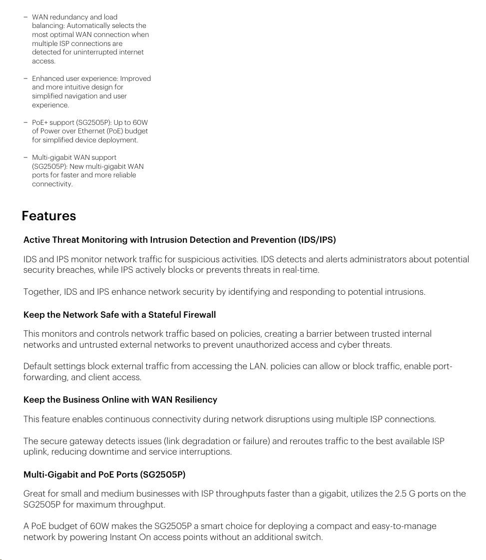 Brak Flicker, zarządzane w chmurze bramy HPE Networking Instant On Secure Gateway są przeznaczone dla małych i rosnących firm, które chcą zwiększyć bezpieczeństwo swojej sieci lub bezpiecznie rozszerzyć działalność na nowe lokalizacje. Te bramy, stworzone specjalnie dla SMB, zapewniają monitorowanie sieci 24/7, silnik IDS/IPS oraz blokowanie domen dla zwiększonego bezpieczeństwa. Dzięki akceleracji sprzętowej, przy aktywnych wszystkich tych funkcjach, brama może nadal zapewniać przepustowość niemal na poziomie linii.