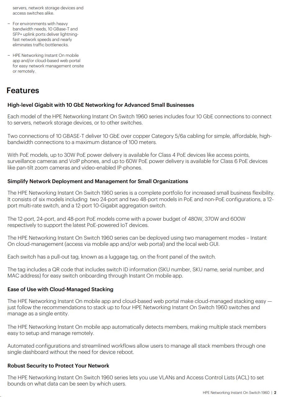 In today's digital-first environment, small businesses face many challenges to stay afloat and competitive. With tight budgets and limited technical expertise, they're struggling to keep up with the explosion of devices and bandwidth-heavy applications running on the network. To optimize both performance and investment, small businesses need cost-effective, next-gen networking solutions. The Aruba Instant On 1960 Switch Series is an easy-to-use and affordable wired solution for networks supporting IT, mobile and cloud applications. Aruba Instant On 1960 Switches are advanced, smart-managed, fixed configuration Gigabit stackable switches designed for small and growing businesses that are easy to deploy and affordable. These switches are designed to scale as business grows, making adding more employees, devices and applications simple. Aruba Instant On 1960 switches are made to handle today's bandwidth-heavy applications like voice and video conferencing, enabling consistent connectivity to improve user experience and application performance.