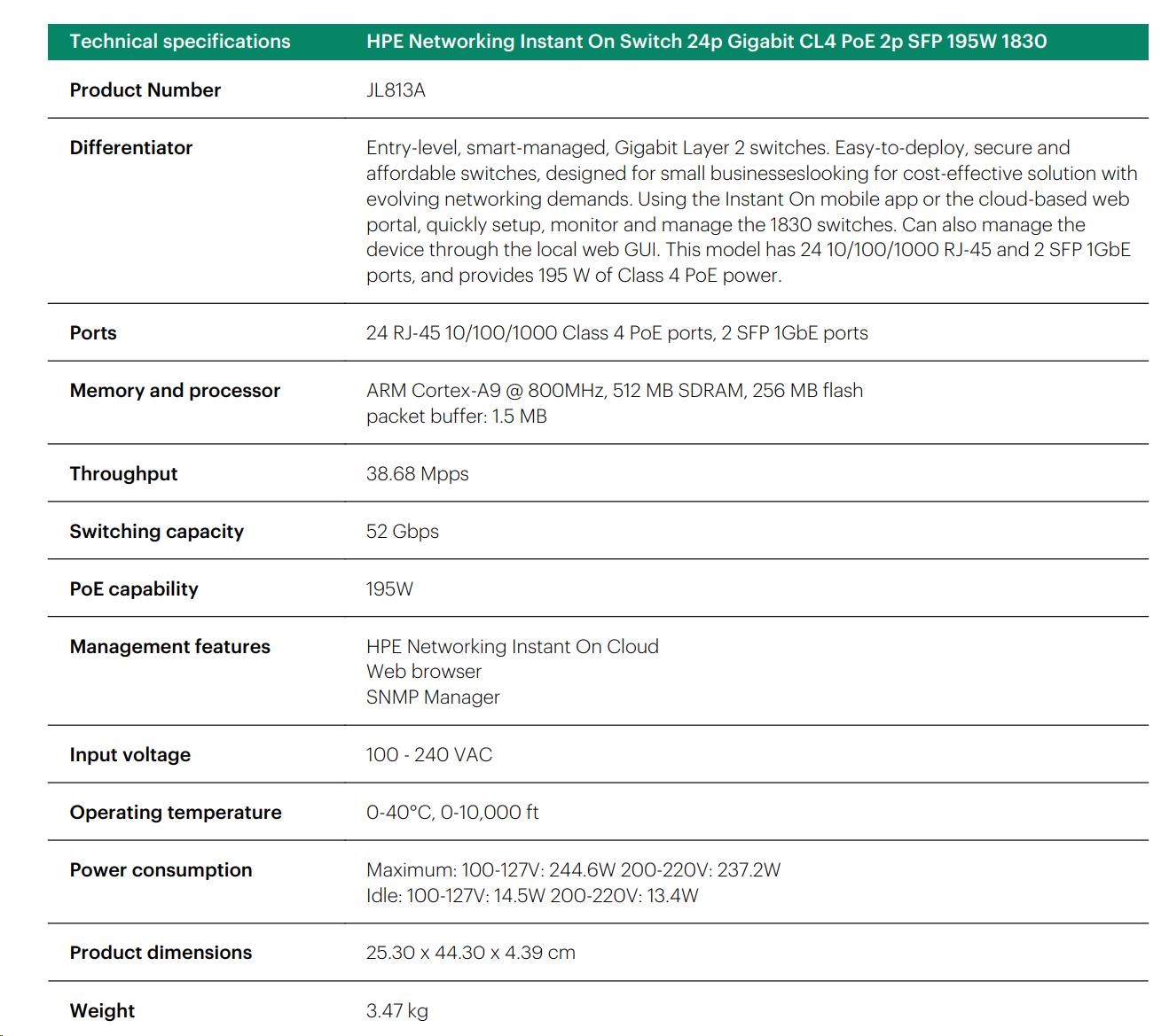 Aruba Instant On 1830 24G 12p Class4 PoE 2SFP 195W Switch (JL813A) |