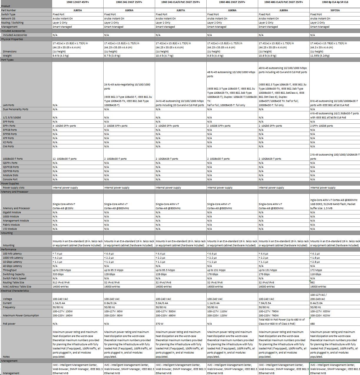 Notes1: 1 Acoustics measured in 23°C semi-anechoic chamber with a loading of 100% traffic and (for JL807A and JL809A) 50% PoE on all ports. Measured in accordance with ISO 7779. Declared in accordance with ECMA-109:2010. Values presented are the Declared A-Weighted Sound Power Level (LWAd) and the mean Bystander A-Weighted Sound Pressure Level (LpAm) |