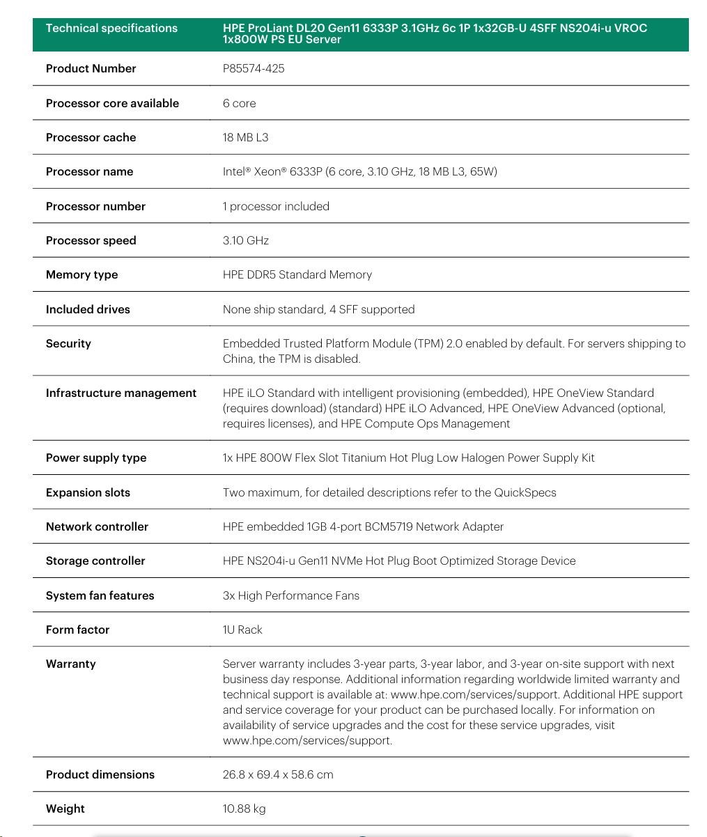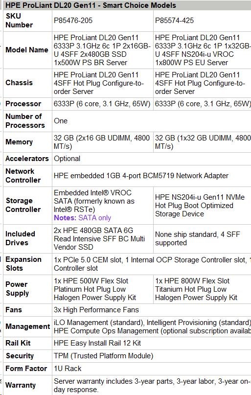 HPE PL DL20 gen11 6333P (3.1G/6C) 1x32G (P64339) 4SFF NS204i-u (2x480Gnvme) VROC 1x800W 4x1G NBD333 Smart Choice