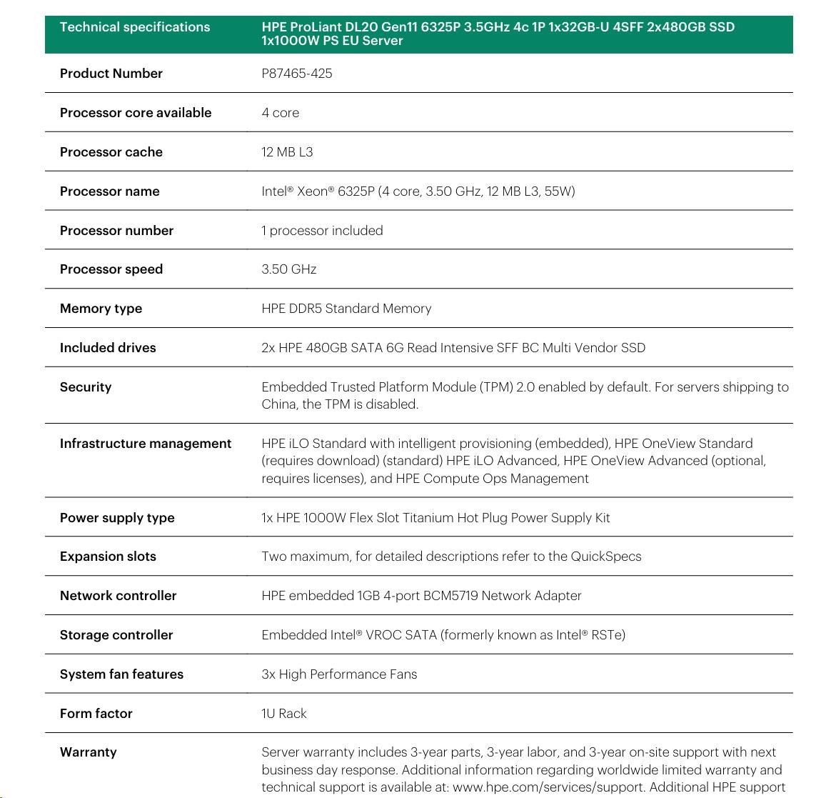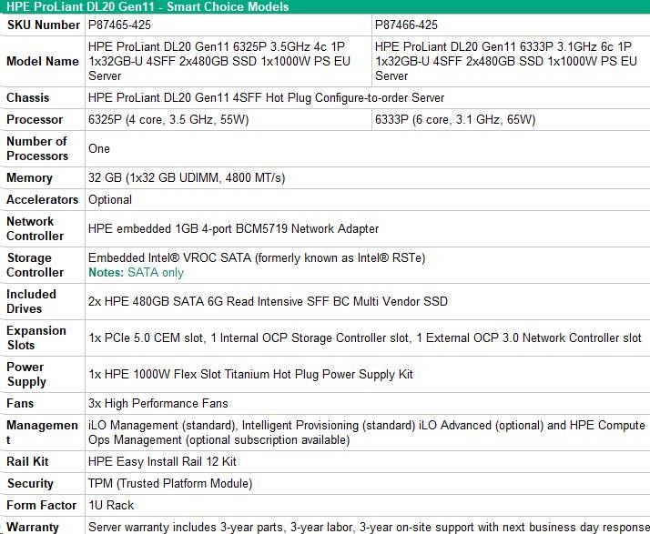 HPE PL DL20g11 6325P (3.5G/4C8T) 1x32G 2x480G SSD VROC 4SFF-HP 4p1Gb 1x1000W Smart Choice
