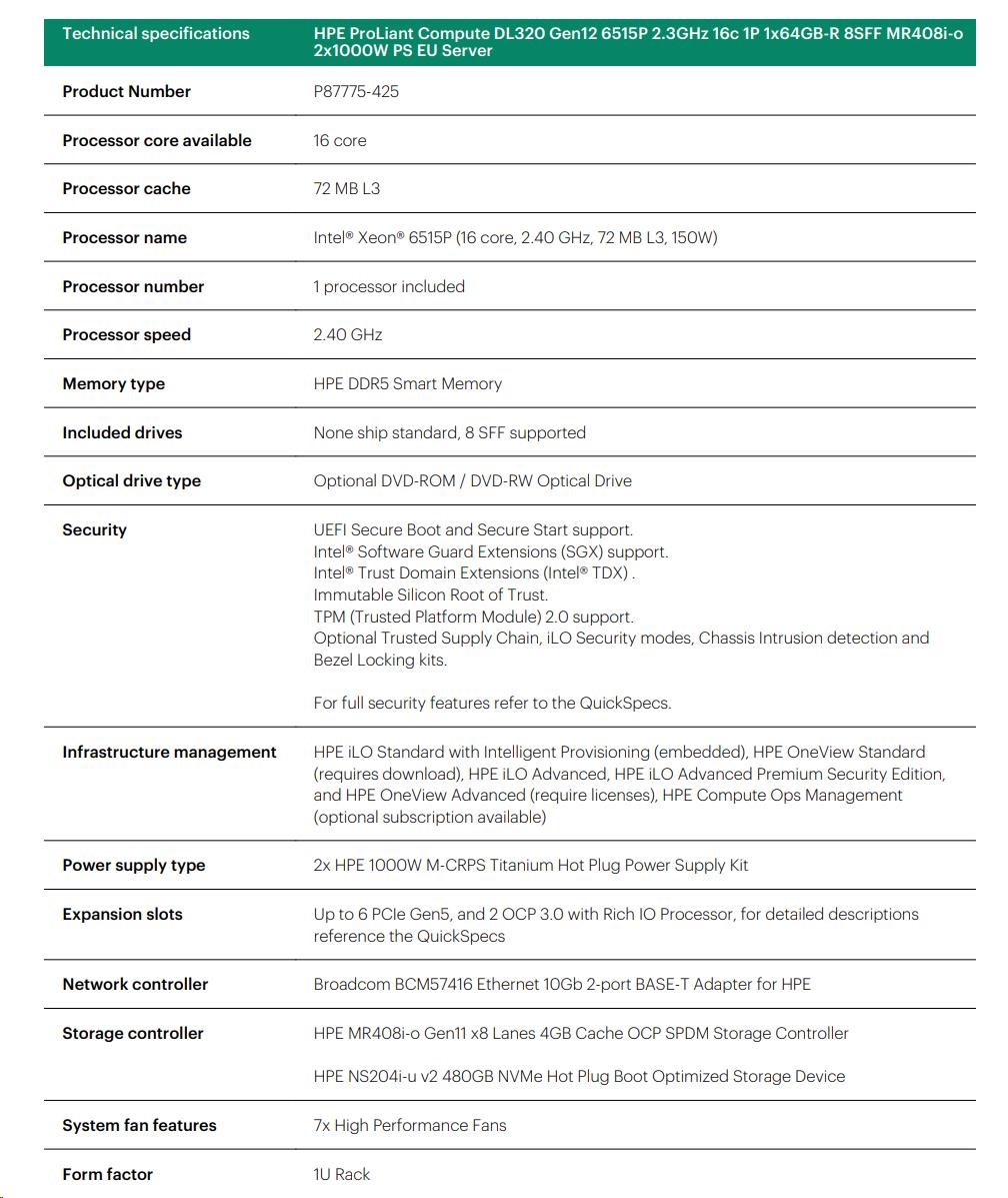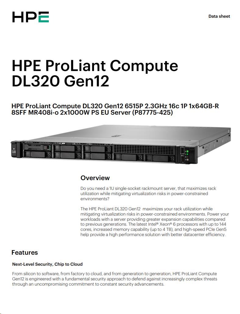 HPE PL DL320 Gen12 6505P (2.2/12C) 1x64G (P69728) 2x480G MR408i-o 8SFF 2x1000W 1GbE NBD333 Smart Choice
