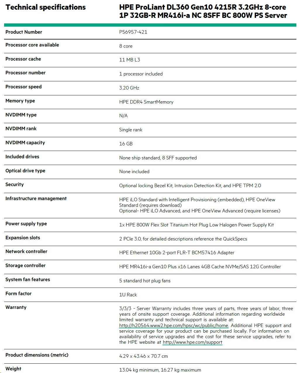 HPE ProLiant DL360 Gen10 4215R 3.20GHz 8-core 1P 32GB-R MR416i-a NC 8SFF BC 800W PS Server |