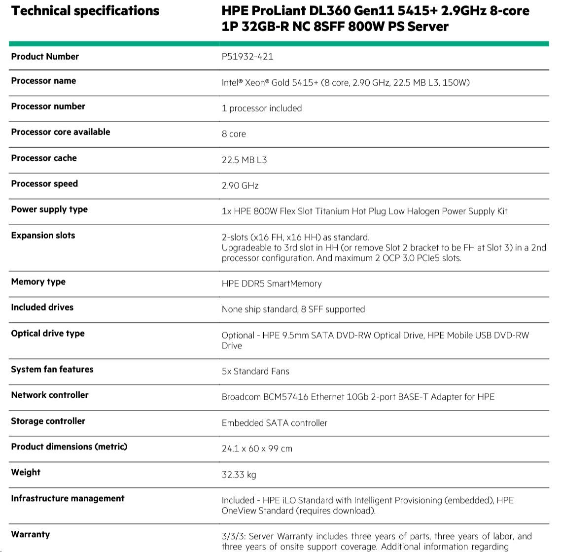 Model Name HPE ProLiant DL360 Gen11 5415+ 2.9GHz 8-core 1P 32GB-R NC 8SFF 800W PS Server