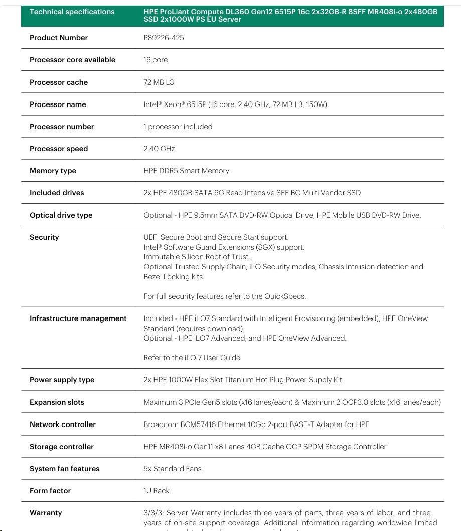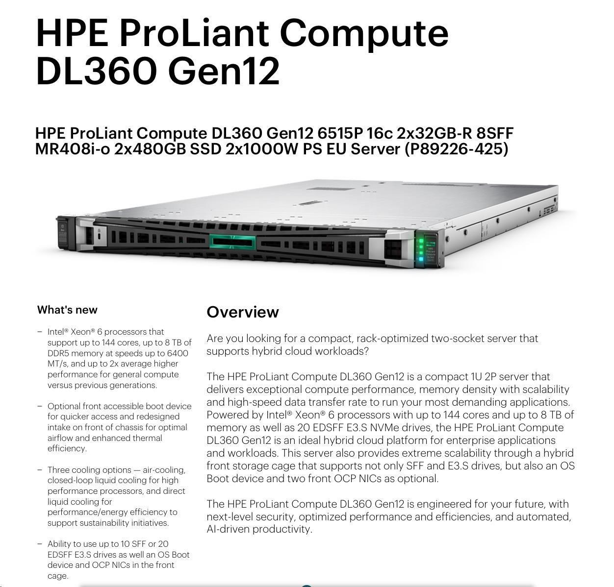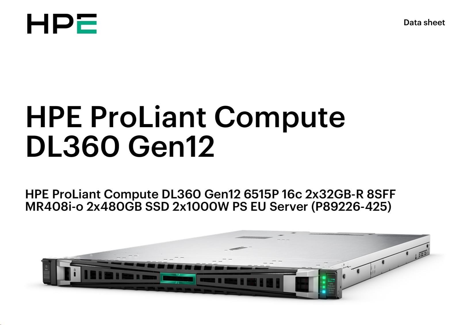 HPE PL DL360g12 6515P (2.4/16C) 2x32G (P69727) NS204i-uv2 MR408i-o 8SFF 2x1000W NBD333 Smart Choice