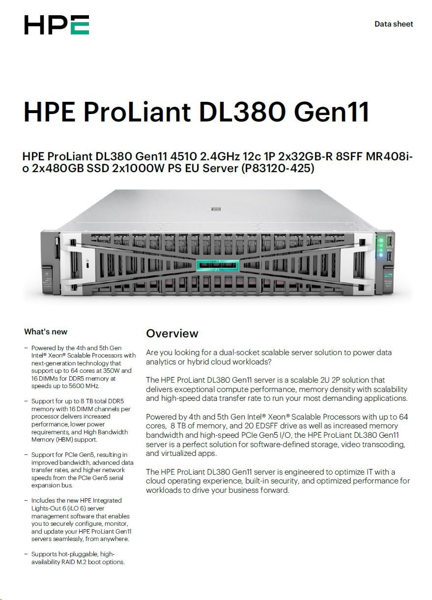 HPE PL DL380g11 4510 (2.4G/12C) 2x32G (p64706) 2x480G 8SFF MR408i-o 2x1000W 4p1To Smart Choice