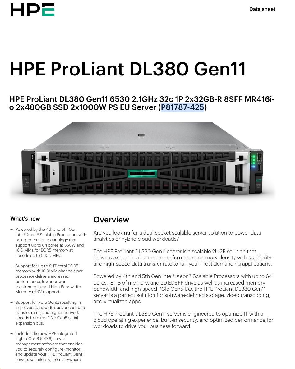 | Product Name | HPE ProLiant DL380 Gen11 6530 2.1GHz 32c 1P 2x32GB-R 8SFF MR416i-o 2x480GB SSD 2x1000W PS EU Server |