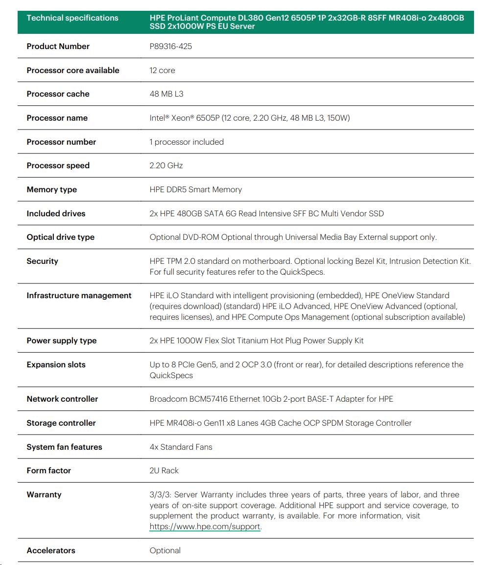 HPE PL DL380 Gen12 6505P (2.2/12C) 2x32G (P69727) 2x480G MR408i-o 8SFF 2x1000W 10GbE NBD333 Smart Choice