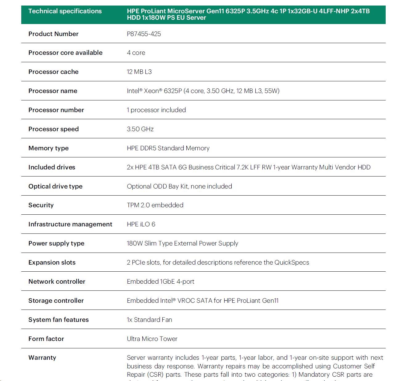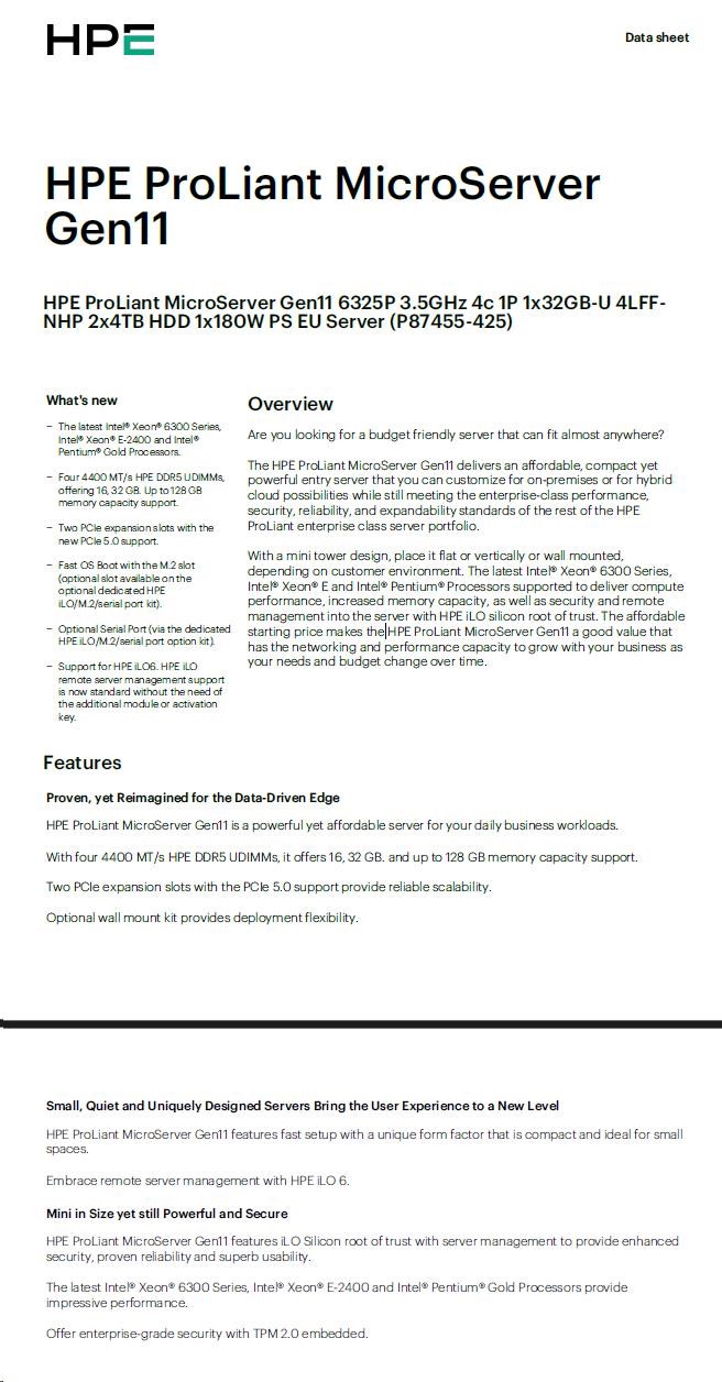HPE PL MicroServer Gen11 6325P (3.5/4C) 1x32G 2x4TB SATA 4LFF/SFF-NHP VROC 4p1G NBD111 Smart Choice