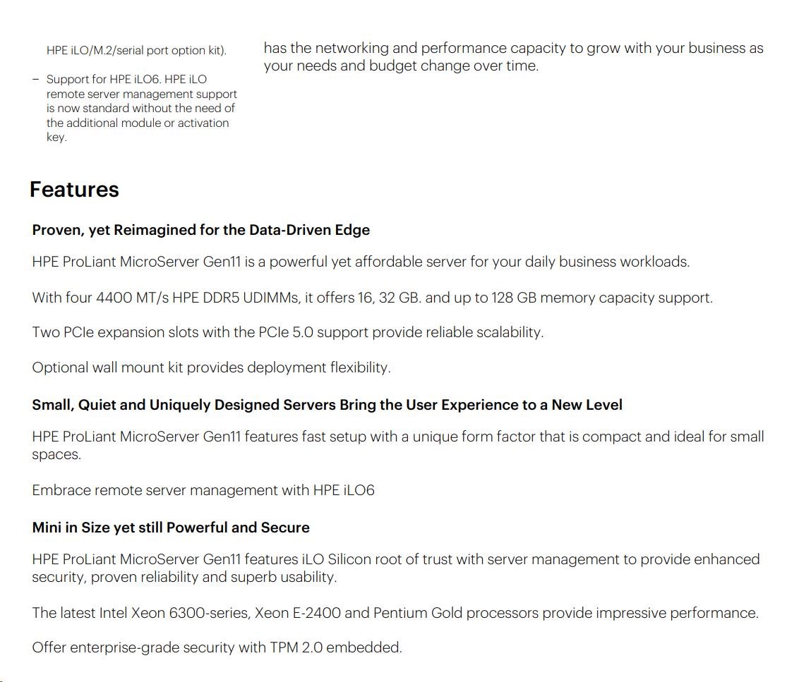 Model Name | HPE ProLiant MicroServer Gen11 E-2434 4c 32GB-U 4LFF-NHP 2x4TB HDD 180W External PS EMEA Cmp Mod Svr |
