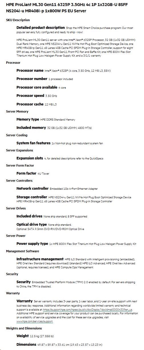 HPE PL ML30 gen11 6325P (3.5G/4C8T) 1x32G 8SFF NS204i-u(2x480g) MR408i-p 2x800W 3/1/1 Smart Choice