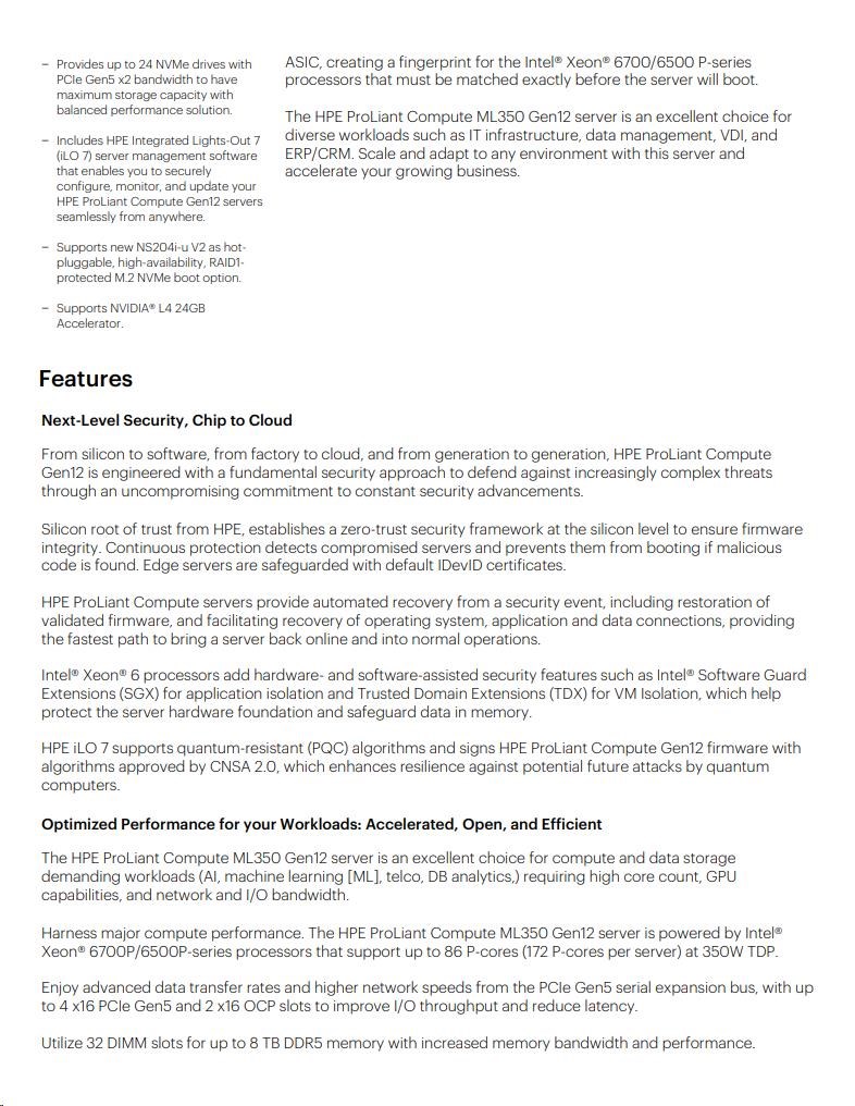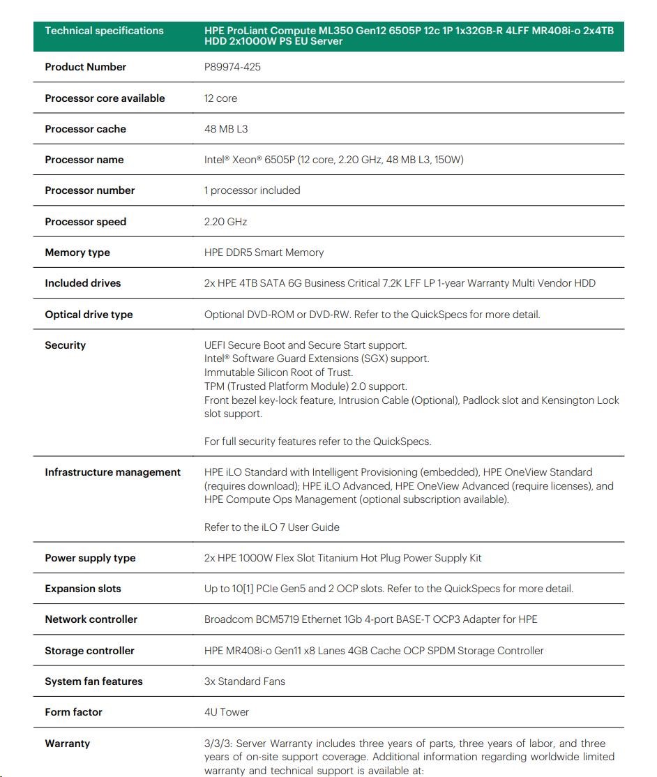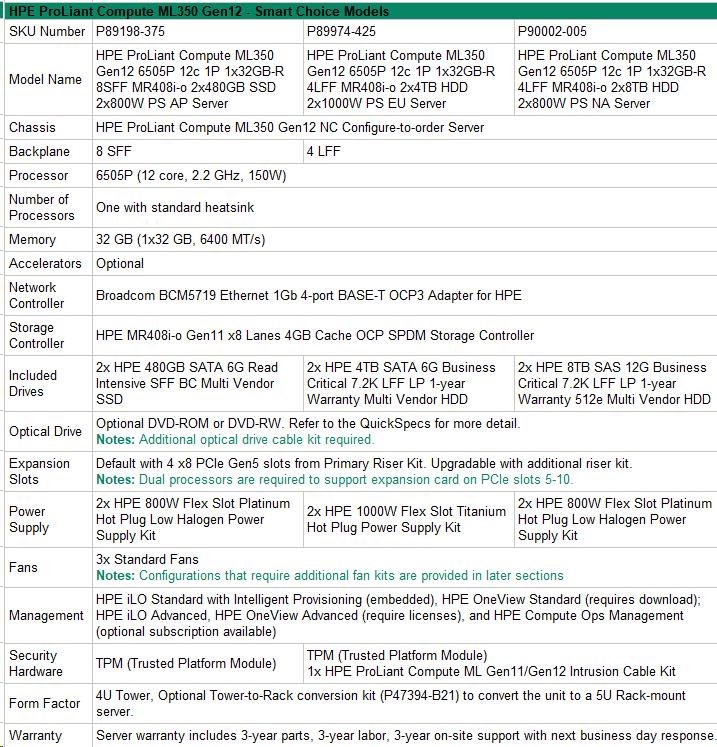HPE PL ML350g12 6505P (2.2/12C) 1x32G (P69727) 2x4TB 4LFF MR408i-o2x1000W 1GbE NBD333 Smart Choice