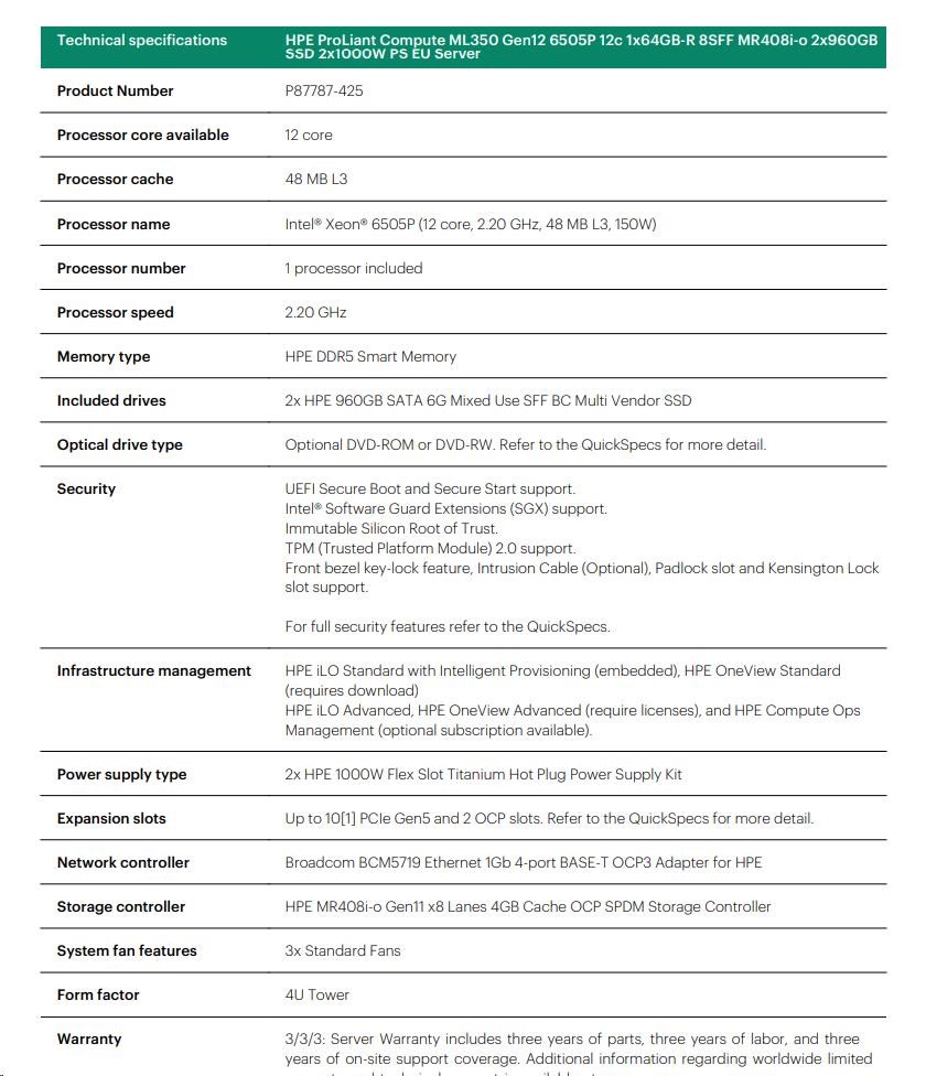 HPE PL ML350g12 6505P (2.2/12C) 1x64G (P69728) 2x960G MR408i-o 8SFF 2x1000W 1GbE NBD333 Smart Choice