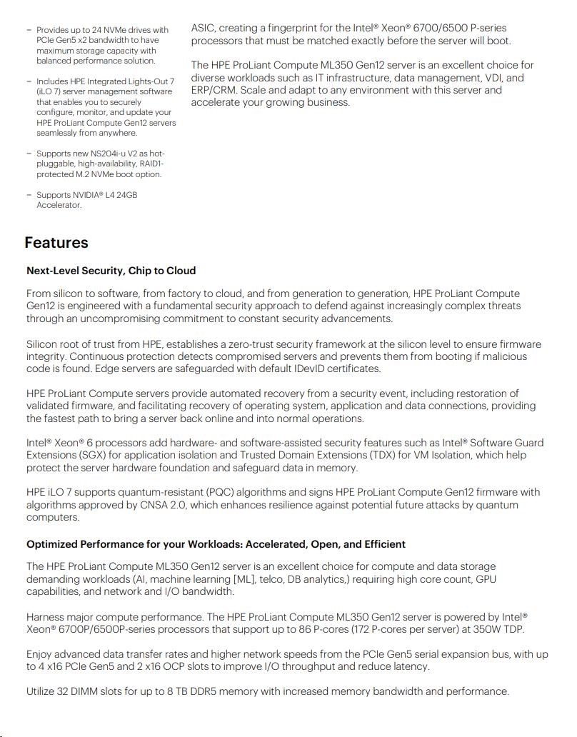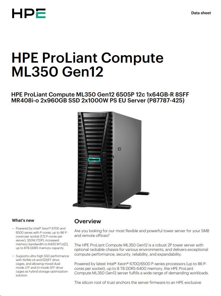 HPE PL ML350 Gen12 6505P (2.2/12C) 1x64G (P69728) 2x960G MR408i-o 8SFF 2x1000W 1GbE NBD333 Smart Choice