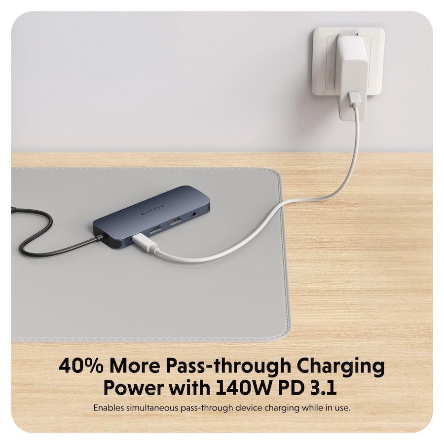 Szybki i niezawodny gigabitowy Ethernet zapewnia wysokoprecyzyjne i stabilne połączenie kablowe z internetem, co umożliwia szybszy transfer danych, płynne streamowanie wideo i lepsze wrażenia podczas grania online. Czas to pieniądze, dlatego pomocny jest USB-C Hub Hyper EcoSmart™ drugiej generacji. Ten sprinter danych podniesie Twoją produktywność na wyższy poziom.Pr pass-through ładowanie za pomocą USB-C Power Delivery 140 W PD 3.1