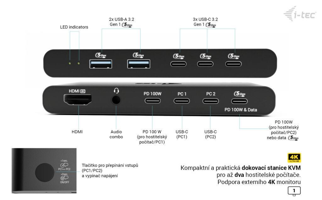 i-tec KVM Docking Station HDMI for 2 hosts, Power Delivery 2x 100W Nowość Twoja cena: Pokaż cenę Dostępność: Zazwyczaj 14 dni Informacje produktowe Kod: 2108650 P/N: C31KVMHDMIDOCKPD Gwarancja: 24 Mies. Producent: i-tec Przedstawiciel w UE: EAN: 8595611707766 Porównaj produkt Parametry Cennik Informacje logistyczne Serwis gwarancyjny Specyfikacje techniczne Počet DP portů: 0 Počet HDMI portů: 1 Počet VGA portů: 0 Počet USB-C: 4 Počet USB-A: 2 LAN: Ne Max. počet ext.monitorů: 1 SD karta: Ne Audio: Audio+Mic VESA podpora: Ne PD (max.W): 100
