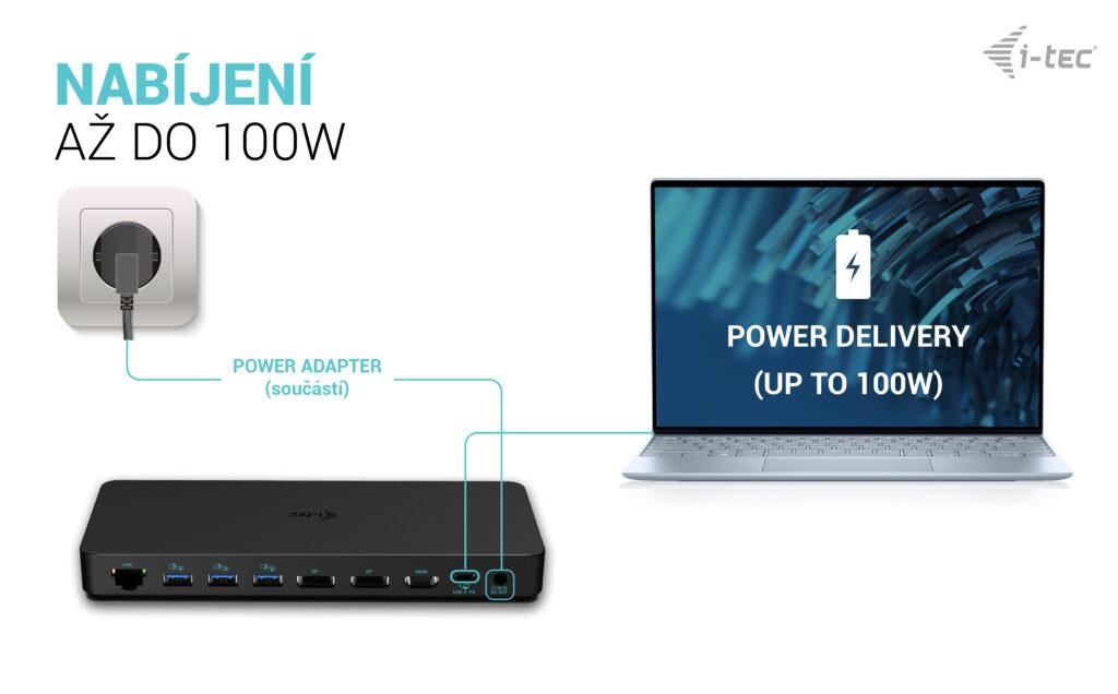 - Stacja dokująca obsługuje do 100W zasilania podłączonego laptopa lub tabletu.
