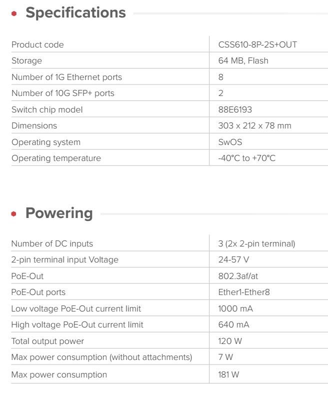 Přepínač může odebírat až 181 W celkem, s rozpočtem 120 W PoE-Out.