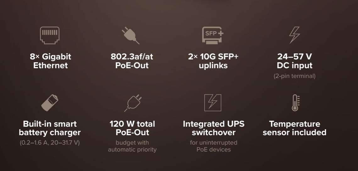 Kompaktní switch PoE s integrovanou UPS a inteligentní nabíječkou baterií – garance bezvýpadkového provozu CCTV kamer a přístupových bodů při výpadcích napájení.