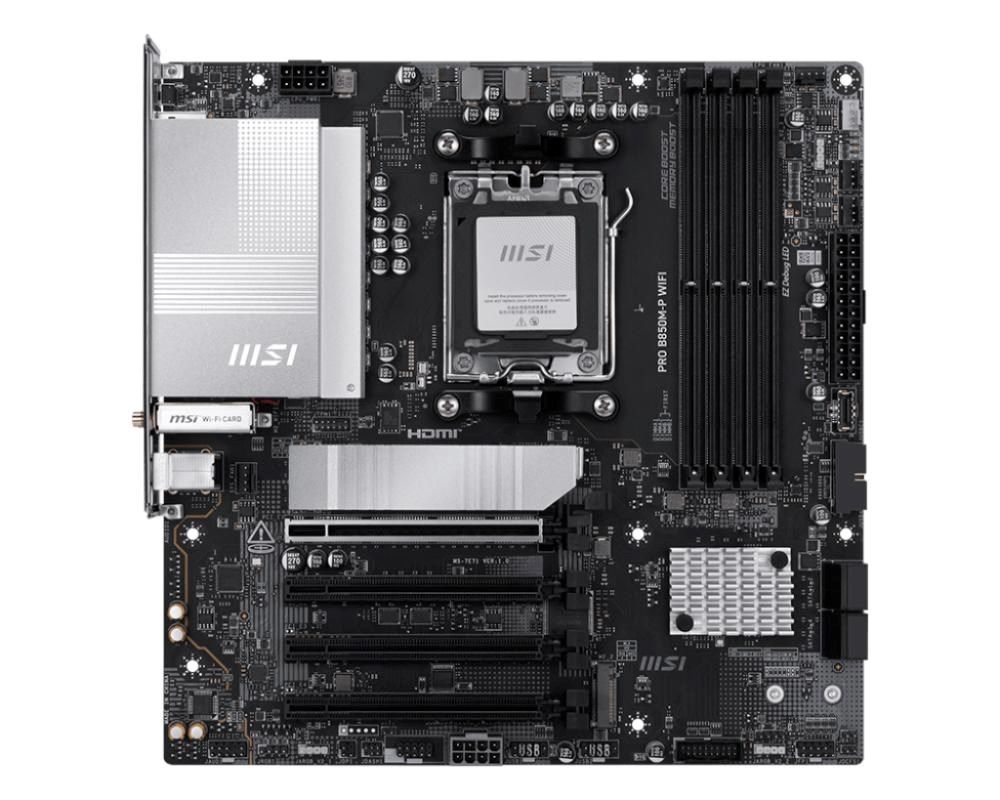 PRO B850M-P WIFI offers a simple design with a harmonious silver color scheme that perfectly matches both white and black PC builds. It is engineered with many exclusive features of MSI, a Wi-Fi 7 with EZ Antenna, 5G LAN, PCIe 5.0 M.2 with EZ M.2 Shield Frozr II, and Supplemental PCIe Power, ready for the AMD Ryzen™ 9000 series processors.