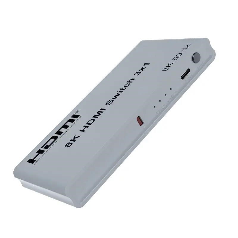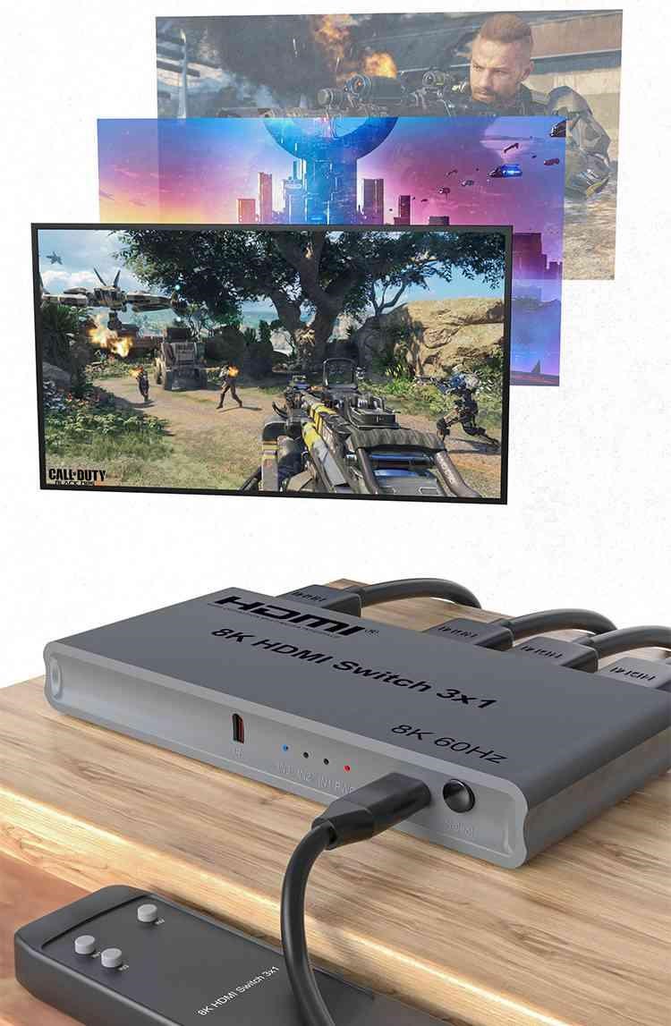 3 urządzenia HDMI na wejściu dzielą 1 wyświetlacz monitor, projektor. Wybór urządzeń wejściowych: 1.automatyczny, 2.wciśnięcie przycisku na przednim panelu przełącznika, 3.pilot zdalnego sterowania