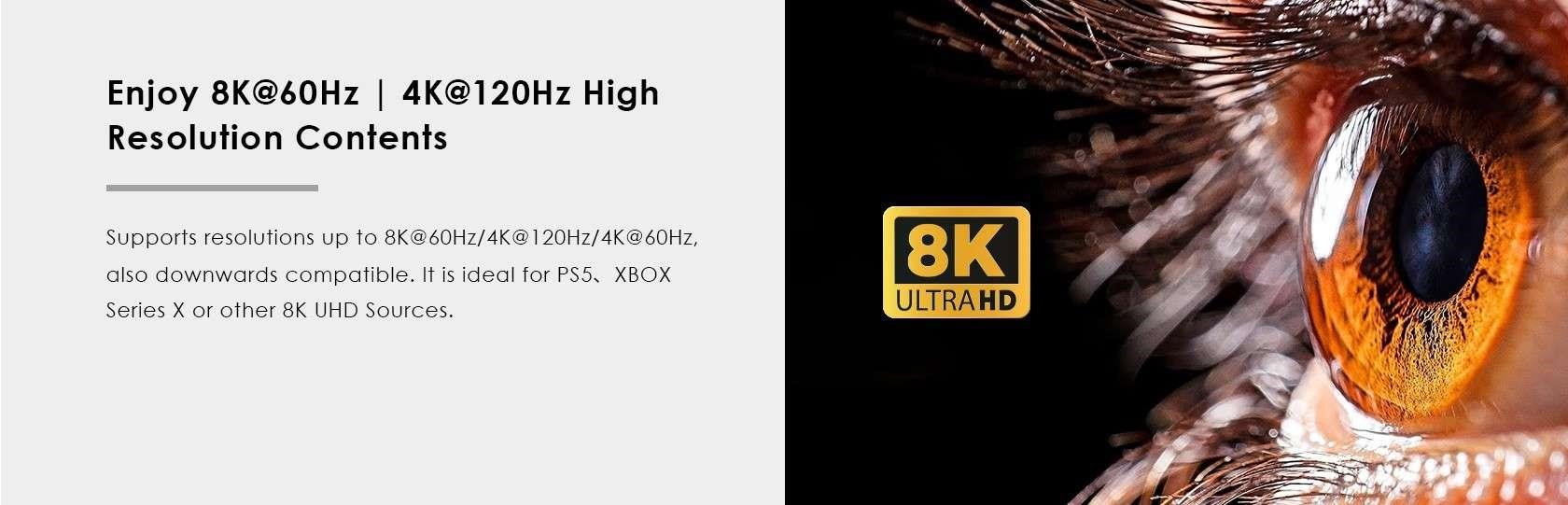- Rozdzielczość: 8K@60Hz, 4K@120Hz, 1080p