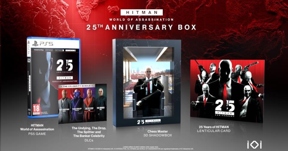Oslavte 25 lat gry HITMAN dzięki wydaniu jubileuszowemu pudełkowemu HITMAN World of Assassination, w którym znajdziesz ekskluzywne gadżety kolekcjonerskie: