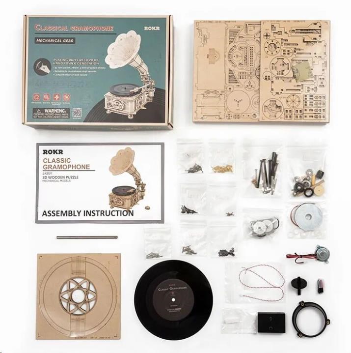 RoboTime 3D dřevěné mechanické puzzle Gramofon (elektrický pohon)