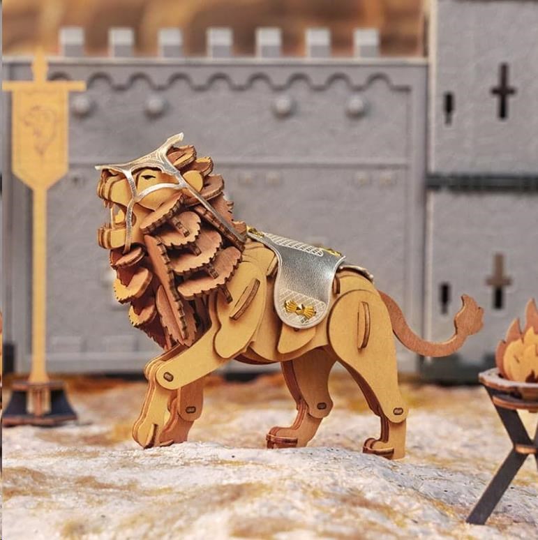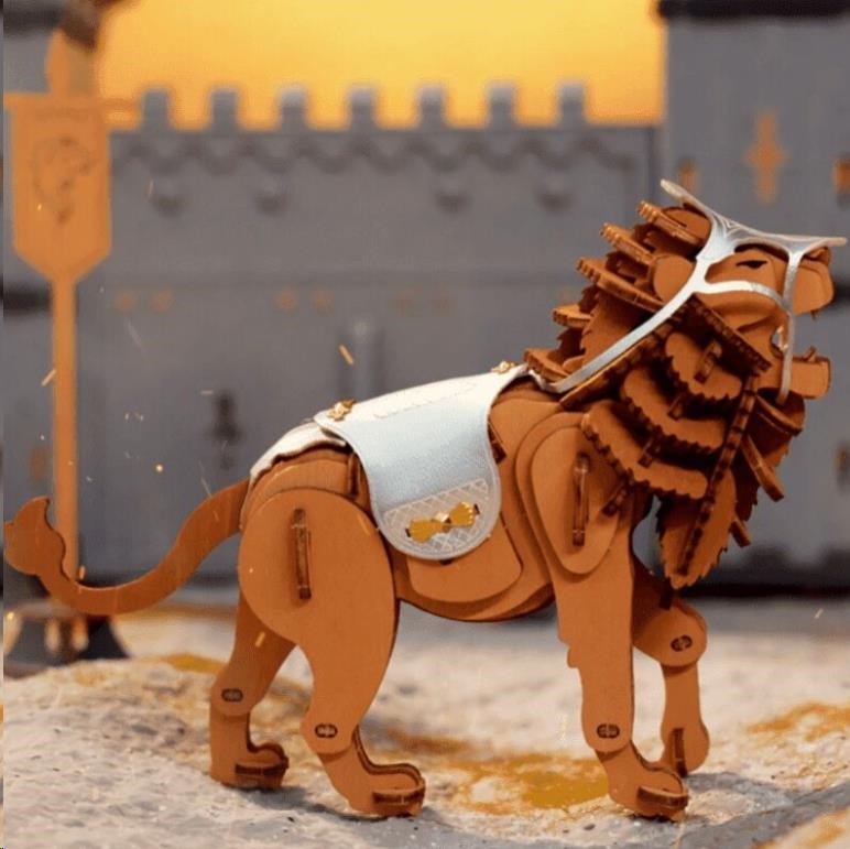 Ten wspaniały wojownik nie może zabraknąć w żadnej bitwie słynnego generała. Z nim żadna bitwa nie będzie przegrana! 3D drewniana układanka Bojowniczy lew - Warior Lion zapewni mnóstwo zabawy nie tylko podczas składania, ale także podczas gry. Doskonale komponuje się z Bojowym słoniem (kod TWA02) i Włochem wojownikiem (TWA04). Model ma ruchome nogi, skórzone srebrne zbroje z złotymi detalami, które zapewniają wszechstronną ochronę przed przebiegłymi wrogami. Jest też piękną dekoracją do wyeksponowania dla miłośników 3D puzzli.