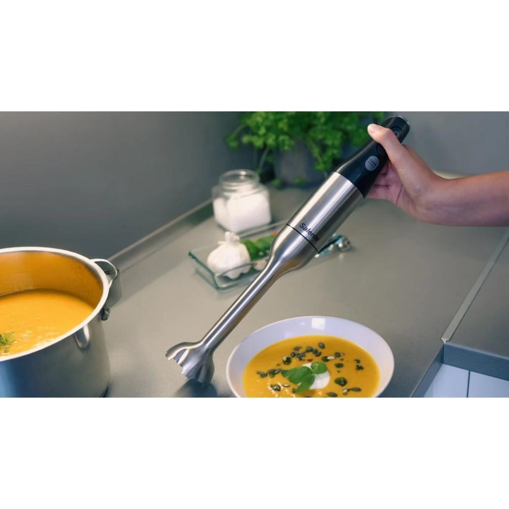 Dowodem przemyślanego wykonania blendera Salente Mixxo jest funkcja AntiSplit, która zapobiega przyleganiu główki miksującej do dna naczynia. Eliminuje rozprysk miksowanych składników, dzięki czemu możesz pracować z pełnym spokojem, nie martwiąc się o bałagan wokół. Niezawodny stalowy korpus głowicy pozwala bez problemu na używanie nawet w gorących, wrzących potrawach, więc nie jesteś ograniczony podczas przygotowania bardziej skomplikowanych dań.
