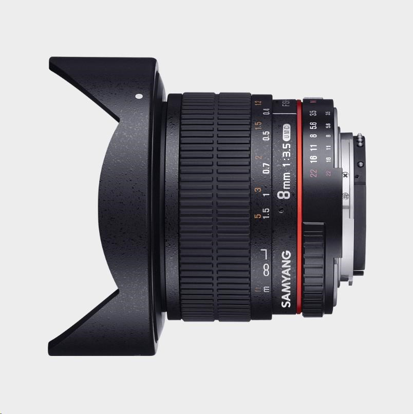 Obiektyw Samyang 8mm f/3.5 UMC Fish-Eye CS II jest specjalnie zaprojektowany dla cyfrowych lustrzanek z matrycą APS-C, ale może być również używany na aparatatch pełnoklatkowych z usuniętym filtry przeciwsłonecznym z obiektywu. Na pełnoklatkowych aparatach zapewnia Samyang 8mm f/3.5 Fish-Eye szerokie pole widzenia, co jest idealne do panoramicznych zdjęć i wirtualnych wycieczek 3D.