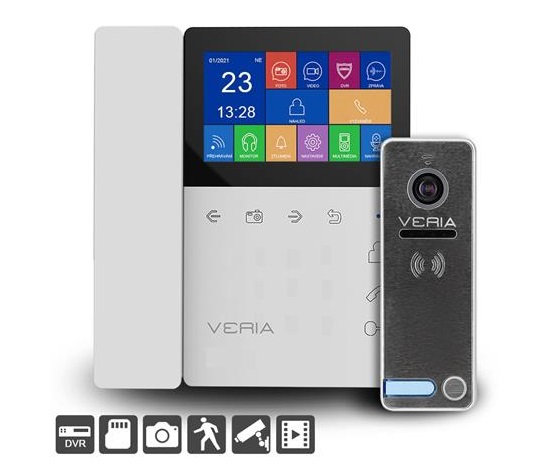 Domowy telefon wideo w eleganckim designie z 4,3 "wyświetlaczem oferuje możliwość zastosowania zarówno hands-free jak i ze słuchawką z możliwością podłączenia słuchawki magnesem do ciała monitora. Do sterowania funkcjami monitora służą klawisze dotykowe. W zestawie znajduje się również stacja wejściowa/drzwiowa z kamerą Veria 230. Menu telefonu wideo jest w całości w języku czeskim.