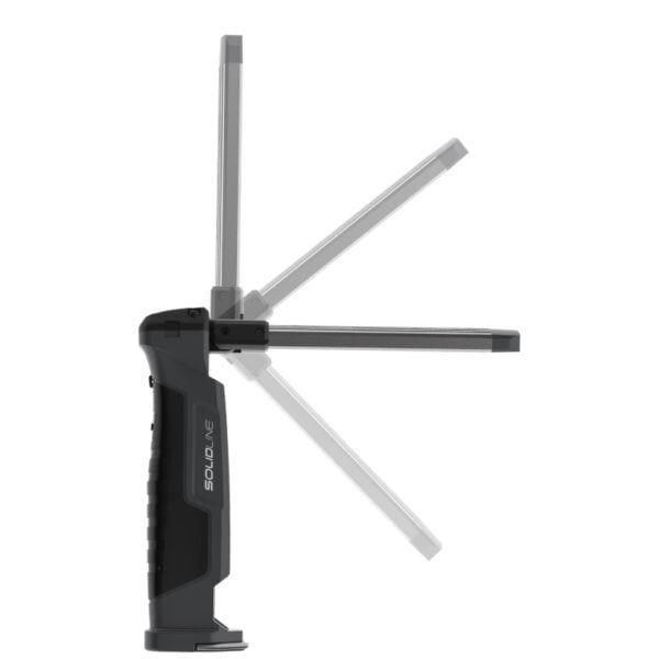 Dzięki aluminiowej głowie lampy można ją złożyć i obrócić o 180°, co zapewnia niezawodne oświetlenie nawet w ciasnych przestrzeniach roboczych. Bocza LED COB zapewnia białe lub czerwone światło w pięciu różnych trybach, natomiast dodatkowa dioda LED punktowa zapewnia punktowe białe światło na dwóch poziomach. Dla optymalnego uchwytu wyposażona jest w gumową rączkę. Wbudowany akumulator Solidline SW2R można łatwo naładować za pomocą micro-USB.